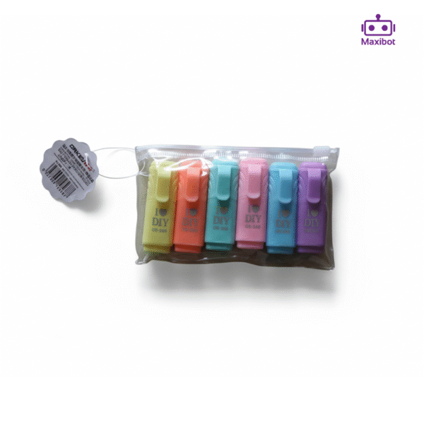 Brand: I β₯ DIY Model: OD-020 Product Type: Pastel Highlighters Set Includes: 6 Colors β Orange, Yellow, Green, Pink, Purple, Blue Packaging: Transparent zippered pouch with barcode tag Design: Slim barrel with printed decorative text and smooth chisel tips