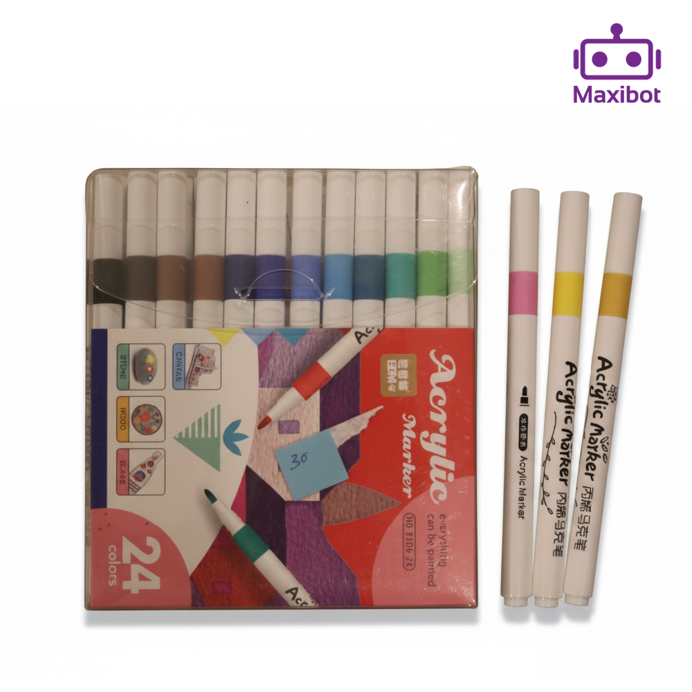 Specifications: A set of 24 colors. Based on common acrylic markers (as per my search results), they are often dual-tip, water-based, and non-toxic. The image confirms the dual-tip feature.