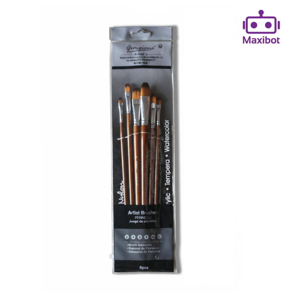 Brand: Georgies® Product Type: Artist Paint Brushes Set Includes: 6 Brushes (varied shapes and sizes) Handle Material: Natural Wood Ferrule: Durable Metal Bristle Type: Synthetic – Ideal for Acrylic, Tempera & Watercolor Packaging: Transparent sleeve with black and gray branding Languages: English & Spanish (“Juego de pinceles”)