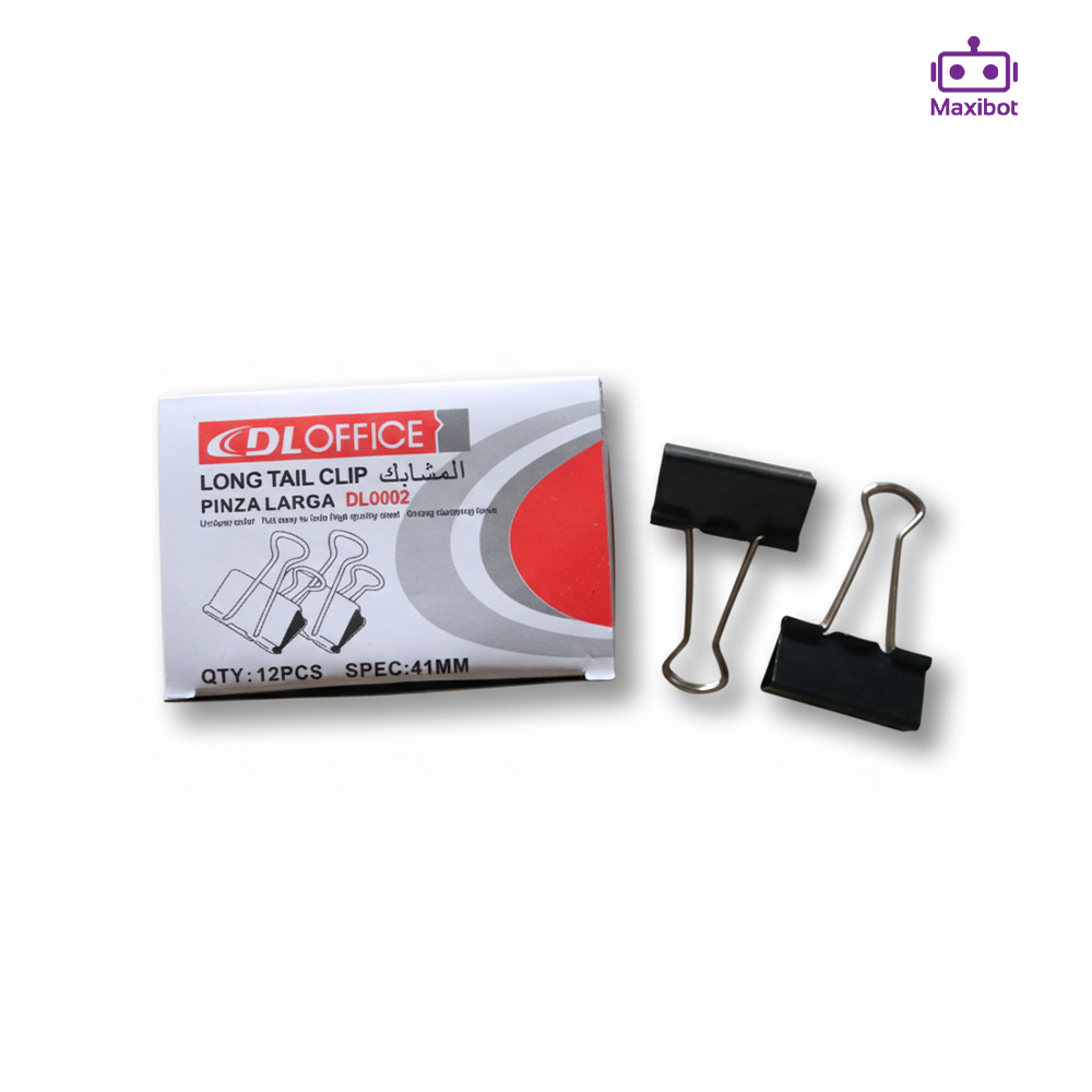 Brand: DLOFFICE Product Type: Long Tail Binder Clips Model: DL0002 Quantity: 12 Pieces Size: 41mm Color: Black Clip with Silver Metal Handles Packaging: Boxed set with multilingual labeling (English, Spanish: Pinza Larga, Arabic)