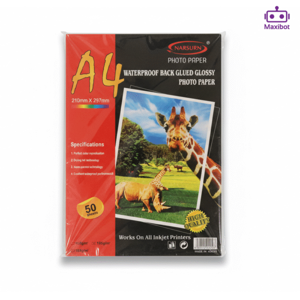 Brand: Narsun Product Type: Waterproof Back-Glued Glossy Photo Paper Size: A4 (210mm x 297mm) Quantity: 50 Sheets Weight: 185gsm Compatibility: Works on all inkjet printers Packaging: Red and black box featuring wildlife imagery