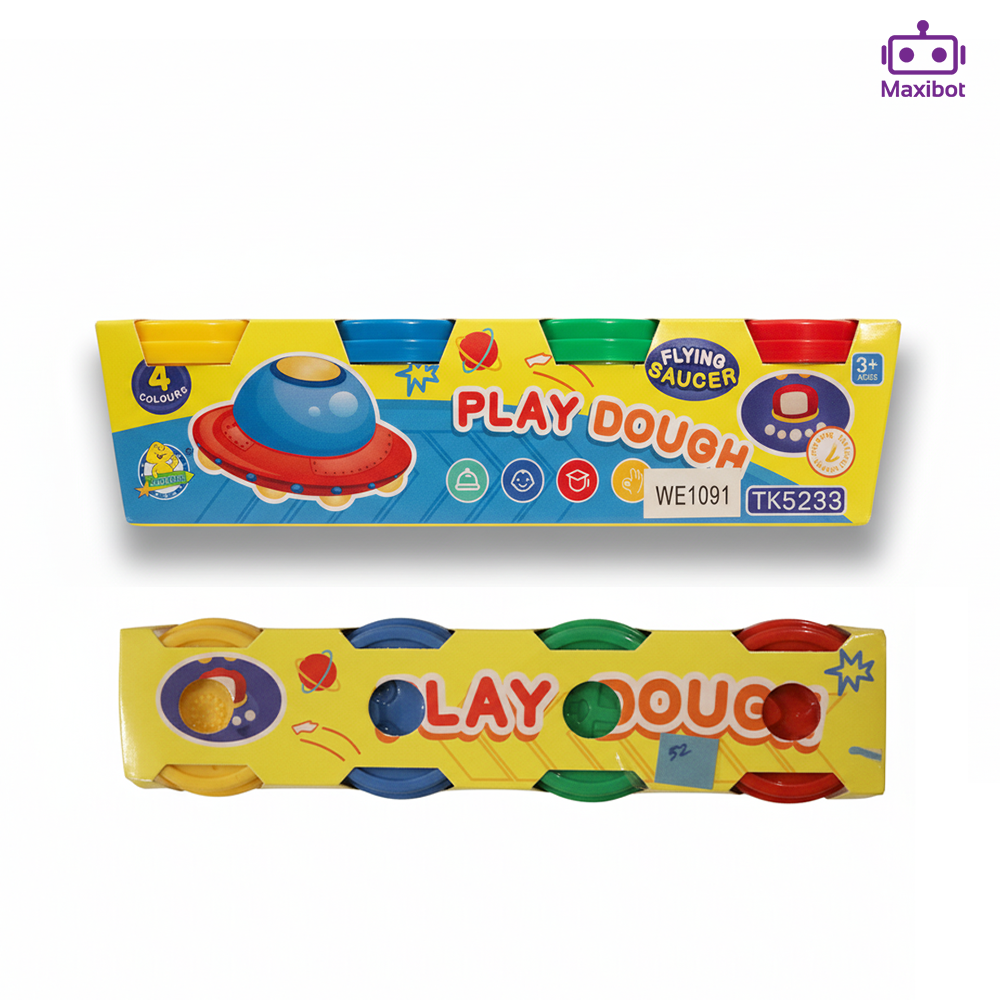 Brand: Maxibot Product Name: Flying Saucer Play Dough Model Number: TK5233 Alternate Code: WE1091 Recommended Age: 3+ years Set Includes: 4 vibrant colors – Yellow, Blue, Green, Red Packaging: Colorful box with cartoon flying saucer, stars, planets, and playful graphics