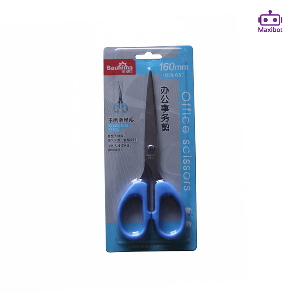 Brand: Bauhinia Product Type: Office Scissors Size: 160mm / 6.5 inches Color: Blue Handles Material: Stainless Steel Blades with Durable Plastic Grips Packaging: Blister pack with bilingual labeling (English & Chinese)