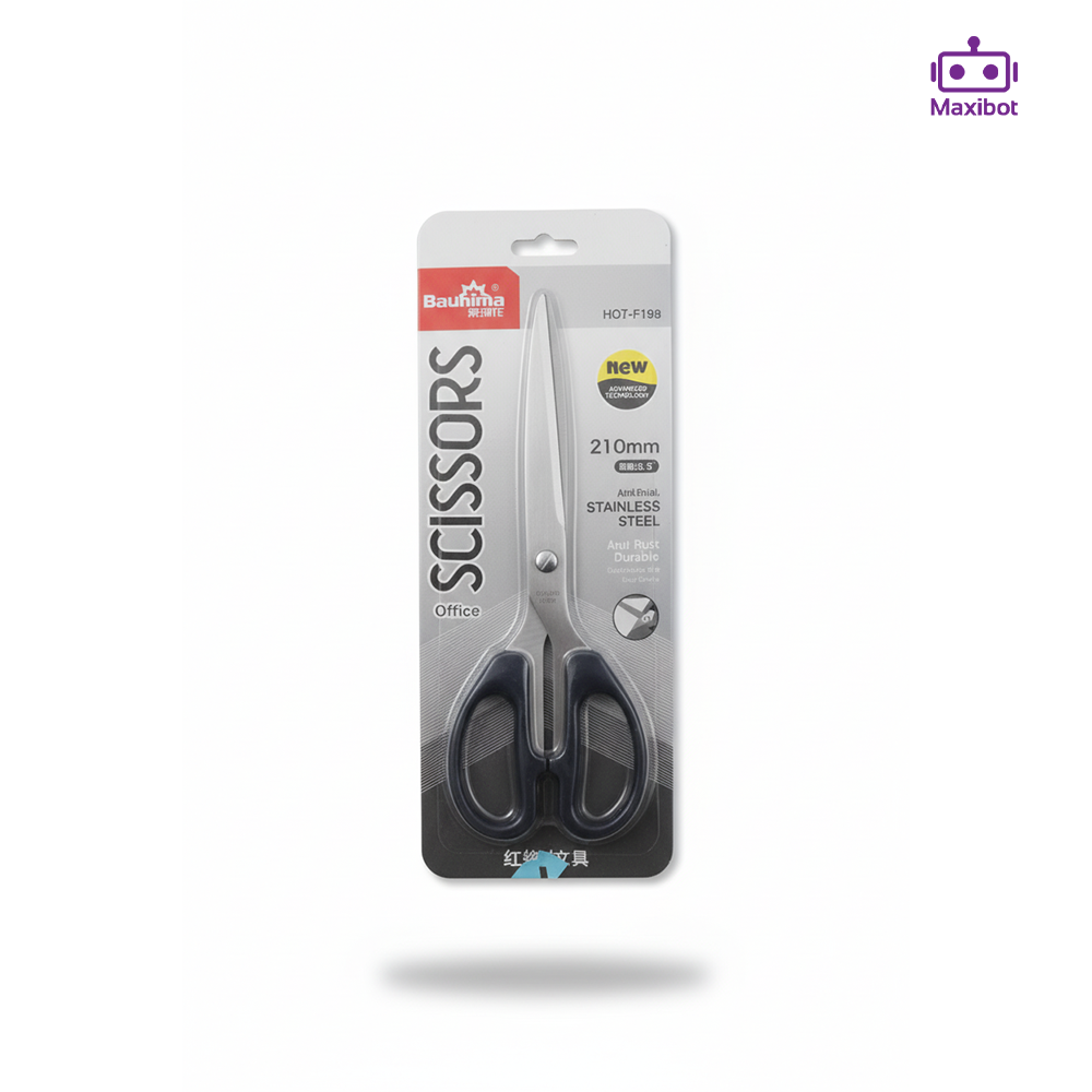 Brand: Bauhinia Model: HOT-F198 Product Type: Office Scissors Length: 210mm Blade Material: Stainless Steel Handle Color: Black Packaging: Blister pack with bilingual labeling (English & Chinese)